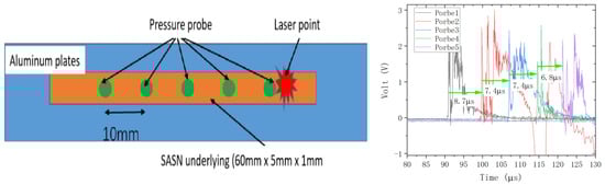 LIHE specimen is shown in Figure 9, and the specimen parameters are shown in Table 3. SASN was dripped in the center of the aluminum plate. A Dynasen pressure probe was placed in the center to measure the pressure and time of arrival. The surface density of SASN was 10–70 mg/cm2