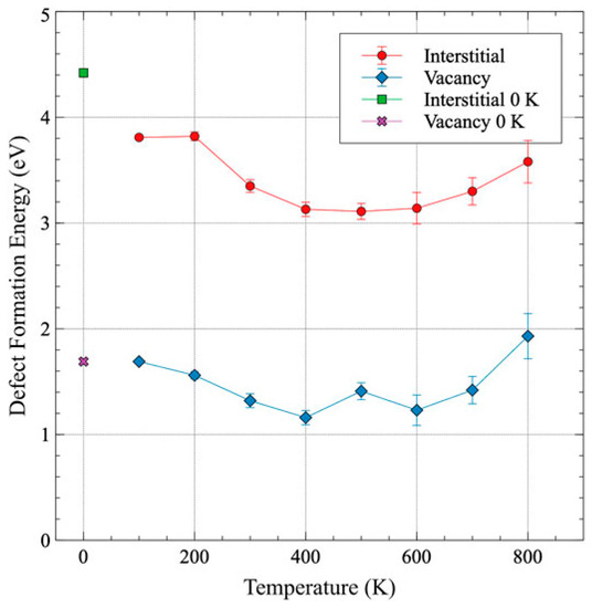 Formation energy of interstitial and vacancy as a function of temperature (reprinted and adapted with permission from [10].