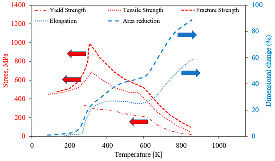 Mechanical properties of α-U as a function of temperature (Reprinted/adapted with permission from Ref. [24], 2022, Springer Nature). Red arrow represents Stress (MPa), and blue Dimensional change (%).