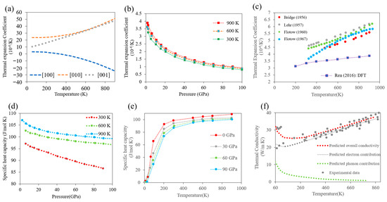 Thermal properties of α-U: (a) anisotropic thermal expansion coefficient in single crystals with different orientation (Reprinted/adapted from Ref. [19], 2022, Elsevier), (b) thermal expansion coefficient as a function of pressure ((“Reprinted/adapted from Ref. [28], 2022, Elsevier), (c) thermal expansion coefficient as a function of temperature: comparisons between the DFT studies [28] and experiments [26,29,30,31] (“Reprinted/adapted from Ref. [28], 2022, Elsevier), (d) specific heat capacity as a function of pressure (“Reprinted/adapted from Ref. [28], 2022,Elsevier)), (e) specific heat capacity as a function of temperature (“Reprinted/adapted from Ref. [28], 2022, Elsevier), (f) thermal conductivity (DFT studies adapted from [20]) compared with available experimental results (Adapted from Ref. [20]).