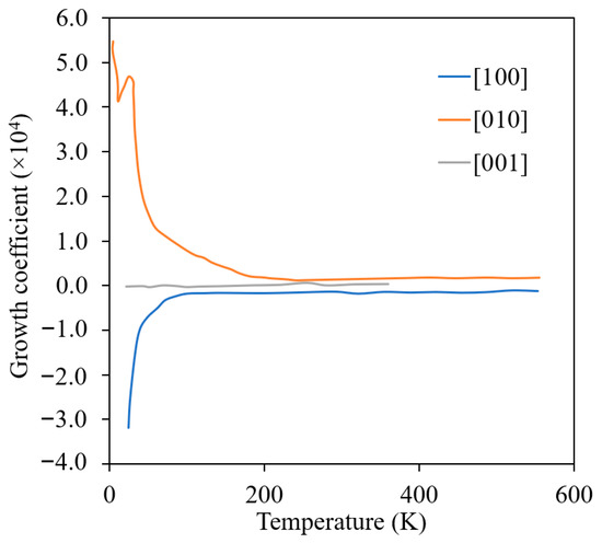 Effect of irradiation temperature on the growth coefficient of α-U single crystals (Reprinted/adapted with permission from Ref. [42], 2022, Taylor & Francis).