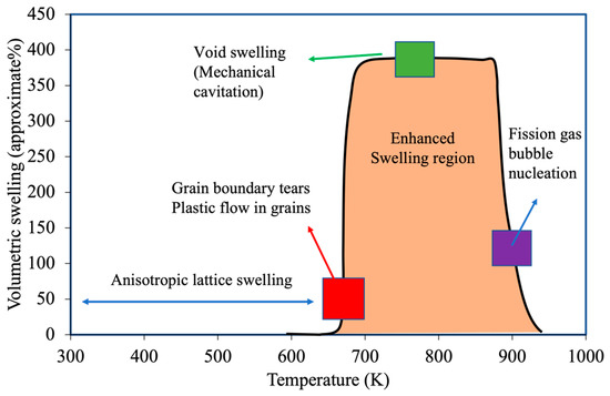Variation in the irradiation swelling behavior and possible mechanisms at different temperature regions.