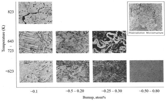 Around the same time, Angerman and Caskey [48] reported microstructural changes in α-U over the range of 403–823 K and at burnups of 0.05 and 0.77 at%. The reactor conditions and neutron flux were not provided. Overall, their observations were very similar to that of Leggett et al. though this study focused on a somewhat lower temperature range and the samples in this study were of lower purity (~1000 ppm impurities by weight). Like Leggett et al., Angerman and Casky also observed several twin systems in most grains and intersecting twins were observed in some areas. Slip within the grains also took place, as evidenced by the bending of the twins. At higher burnups, more distorted grain structures were observed, likely due to deformation by slip. Small fission gas bubbles were uniformly distributed in the samples irradiated below 673 K, similar to other observations [44]. The authors observed the formation of irregular cavities in several samples irradiated above 723 K, which contributed significantly to the overall swelling. The metallographic analysis shown in Figure 9 reveals large cavities with a range of length (10–200 microns), especially at high irradiation temperature. The cavities were mostly found in grain boundaries or junctions with angular incisions. Angerman and Caskey [48] reported pronounced variations in microstructure and cavitation (formation of mechanical cavities/voids) with burnup, as shown in Figure 9. At burnups below 0.1 at%, the grain structure of the uranium was easily recognizable regardless of the irradiation temperature, though some grain boundary cracking was observed at high irradiation temperatures. This grain boundary cracking is likely a result of thermal expansion stress at high temperature, hypothesized in [49]. Thermal cycling experiments without irradiation found that polycrystalline samples deformed significantly and developed interior cracks with about 100 K temperature difference, and recent modeling has shown that thermal stresses arising from the negative thermal expansion coefficient is sufficient to cause cracking after a temperature change of about 100 K in irradiated α-U. At burnups of 0.15 to 0.3 at%, the grain structure became twisted and distorted as the result of deformation by slip. Uniform and fine “marbleized” structures were observed at burnups of 0.6 to 0.8 at%, though data are only available only at temperatures below 623 K.