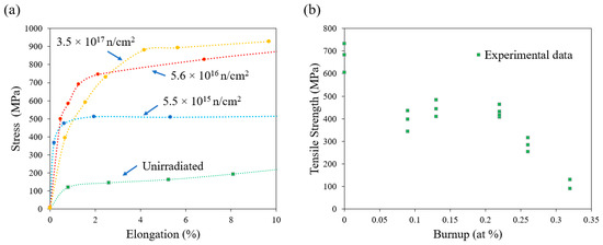 The effect of irradiation on the creep and ductility of single crystal α-U remains unclear. High-purity single crystals of α-U were irradiated and then mechanically tested, and the single crystals retained considerable ductility (Figure 10a). Conversely, significantly lowered elongations were observed in polycrystalline α-U by Vorob’ev [52] and Konobeevskii et al. [53] (Figure 10b). Konobeevskii et al. [53] attributed such reduction to the formation of numerous internal cracks in polycrystalline metal as a result of irradiation. The initial study on creep testing in irradiated U was also reported by Konobeevsky et al. [53], who irradiated the material and then creep-tested it out of pile. The creep rate was increased by a factor of 1.5 to 2 versus the un-irradiated material. Following this, Roberts and Cottrell [54] conducted in situ creep testing in an irradiation environment, and observed a similar enhancement in creep during irradiation.