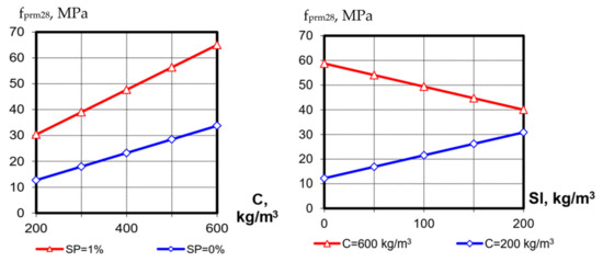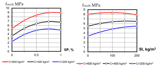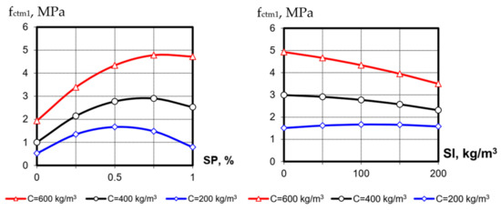 The values of splitting tensile strength at the 1st day (fctm1) varied from 0.4 to 5.44 MPa and at 28 days (fctm28), from 1.35 to 8.9 MPa. Following the mathematical models, the nature of the variable factors’ influence on splitting tensile strength is almost the same as for compressive one (Figure 3 and Figure 4). Only the more noticeable positive effect of blast-furnace-slag content on fctm at 28 days is noteworthy, especially at low cement consumption. As known [19], splitting tensile strength is mainly determined by the cement stone strength and its amount in concrete, so at low cement consumption, such an effect of increasing the total amount of binder with a long interaction of active additives and cement is expected.