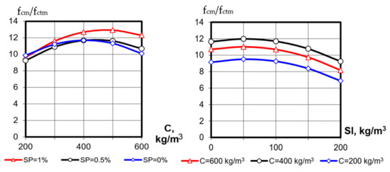The optimal content of the SP additive is significantly related to the cement consumption—at a minimum content of C just 0.5% of SP is enough to maximize the strength; at a maximum cement consumption the optimal SP content is 0.8–1.1. With the increase in the slag content, the optimal content of the additive and its effectiveness slightly decreases (Figure 1).