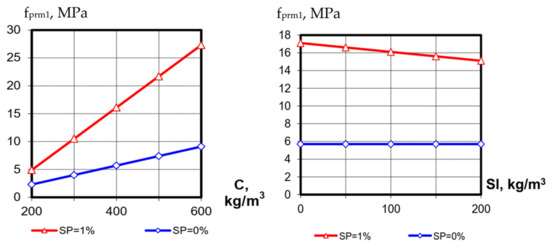 The prismatic strength after one day of hardening ranged from 2 to 32 MPa, which corresponded to 78% of concrete cubes’ strength at the same age. The highest influence on the prismatic strength is caused by factors X1 (C) and X2 (SP), which first of all cause a decrease in W/C in transition from the lower to the upper level (Figure 6). Factor X3 (content of blast-furnace granulated slag) has little effect on the prismatic strength after one day of hardening.