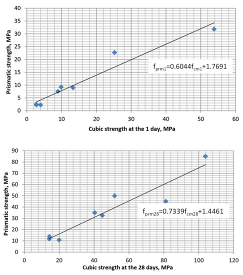 The influence of other factors (cement consumption and SP content) on the prismatic strength at 28 days is similar to that after 1 day of hardening. The strength varies from 11 to 85 MPa. The mean value of the ratio between cubic and prismatic strength at 28 days is like after one day of hardening: 78%. The correlation between these concrete characteristics is shown in Figure 8.