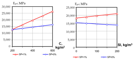 At transition of factors X1 (C, kg/m3) and X2 (SP, %) from the lower level to the upper one the SCC modulus of elasticity increases on average from 10,000–12,000 to 20,000–26,000 MPa at 1 day and from 20,000–30,000 to 40,000–50,000 MPa at 28 days. The positive interaction coefficient of these factors (b12, Table 4) indicates a significant increase in the modulus of elasticity values with a simultaneous increase in cement consumption and superplasticizer content, both after 1 day and after 28 days of hardening. Factor X3 (slag consumption) on average has less effect on the modulus of elasticity than X1 and X2, but its effect is significantly enhanced by the simultaneous influence of other factors. At low cement consumption (C = 200 kg/m3) the increase in slag consumption increases Epr by 1.5–1.7 times both at early hardening stages and at 28 days; however, at high cement consumption the same factor causes a significant reduction in SCC modulus of elasticity (Figure 9 and Figure 10).