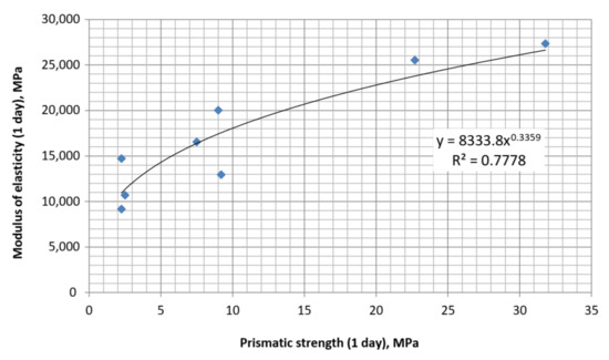 Correlation between the modulus of elasticity and prismatic strength at 1 day.
