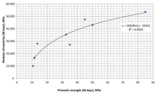 Correlation between the modulus of elasticity and prismatic strength at 28 days.