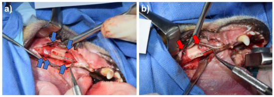 Representative surgical photos for the implantation of (a) the magnesium fixation screw and (b) the titanium fixation screw, when used to fixate a collagen membrane in a GBR procedure in the lower left jaw in beagle dogs. In both images, two treatment sites are partially visible. The magnesium screws (indicated by the blue arrows) appear black due to their magnesium fluoride surface, whereas the titanium screws appear silver shiny (indicated by the red arrows).