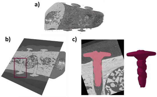 Demonstration of the workflow to obtain the volume and surface area values for each of the implanted screws (3.5 mm in length). µCT scans were taken from the one-week timepoint and show that the magnesium fixations screws remain largely intact. (a) µCT of defect; (b) Location of the magnesium fixation screws identified; (c) Extraction of screw volumes after alignment and segmentation.