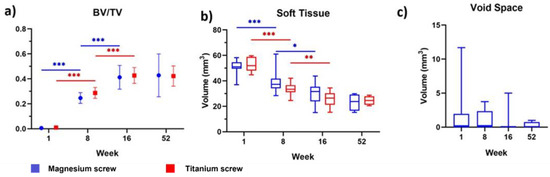 µCT measured values of (a) new bone volume/total defect volume, (b) soft tissue volume, and (c) total void (gas cavity) volume in the defect. Results shown are for defects treated with a bovine bone graft and a collagen membrane fixated with either magnesium (blue) or titanium (red) fixation screws. At each timepoint in (a,b), there are no significant differences between each treatment group. In (c), there are no significant differences between each sequential timepoint. Error bars show the standard deviation in (a) and the range in (b,c). p values are represented on the figures as follows: p < 0.05: *, p < 0.01: **, and p < 0.001: ***.