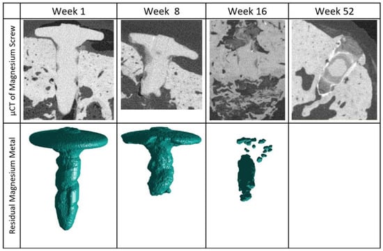At 52 weeks, the µCT data appear to show screw debris and a remaining outline of the magnesium screw. Due to limitations of the µCT and subsequent analysis technique it was not possible to determine if any of the remnants were metallic in structure. Other studies reporting the clinical application of magnesium alloy orthopedic screws have also found a persistent outline of the magnesium screw long after the screw is expected to have fully corroded [14]. As these studies are clinical, there has been no further analysis made on the observations in the form of bone biopsies; however, Seitz et al. hypothesize that the remnants most likely correspond to mineralized tissue.