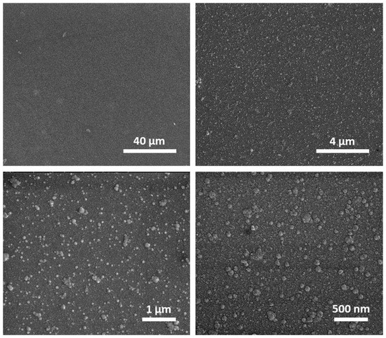 The SEM analysis of the bare titania surface (sample R0) under various magnifications was performed to examine the properties of the surface. As shown in Figure 1, the glass slide is covered with a continuous and tight titania film; however, at higher magnification, random particles or agglomerates of these particles with sizes up to 100 nm are visible. The analysis of the AFM images for the R0 sample also confirms the presence of particles/agglomerates present on the bare TiO2 surface—an exemplary photo of this sample is shown in Figure 2a.