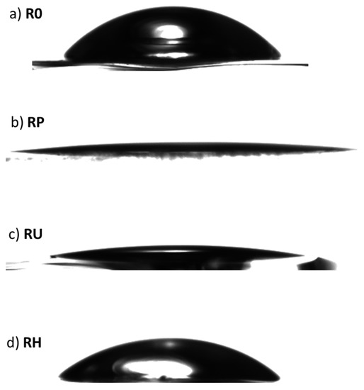 Figure 3. Wettability of the initial, untreated R0 titania surface (a) and the resulting RP titania surfaces directly after activation with oxygen plasma (b), RU samples activated with UV (c), and RH surface activated with H2O2 (d) as presented by the shape of the photographed water drop.