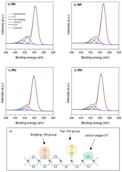Very interesting conclusions can be drawn from thorough analysis of the deconvoluted O 1s signal (the most indicative and most frequently discussed signal in the literature in relation to titania materials [33,40,41,42]). After Shirley background subtraction and deconvolution, the O 1s core energy level of the untreated R0 titania surface gives rise to four components, as shown in Figure 4a. The main component at 530.0 eV BE can be undoubtedly interpreted as originating from bulk O2− oxygen atoms in titania lattice, which was always reported for TiO2 samples. The two other components should correspond to the surface groups. Two different OH groups have been reported in the literature for hydrated/activated titania surfaces: acidic hydroxyl groups linked to the bridging oxygens and basic hydroxyl groups bonded to five-coordinated Ti4+ cations. Indeed, the existence of the two next components shifted ≈1.6 eV and ≈2.9 eV compared to the main bulk peak is observed. These shifted components can be attributed to the two types of hydroxyl groups on the titania surface: (i) a two-fold bridging −OH group with acidic character (shifted 1.6 eV) and (ii) a single-fold ones “top” −OH group with basic character (shifted ≈2.9 eV) [43,44]. The weakest contribution at ≈533.6 eV can be tentatively attributed to the oxygen of molecularly physisorbed water in the upper hydration layer [33].