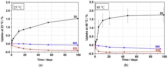 To get a first insight into the absorption properties of DI, NH, and EG in PMMA, absorption tests were performed. The uptake of the SCA was measured by the increase in the weight of the samples. The results are shown in Figure 2 at 23 °C (a) and 48 °C (b).