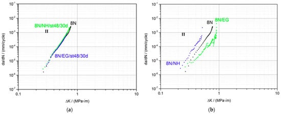 For the second part, the influence of SCA on the mechanical behavior of PMMA in the fatigue crack propagation test was investigated. The focus was on how the SCA and the wetting process affect crack propagation. This was assessed by using the characteristic values: ΔKth, the slope of the FCP curve in area II, and Kcmax. Figure 3 shows the FCP measurements for the pure PMMA without medium and the ESC behavior for the type of wetting, (a) previous immersion of the CT sample with crack for 30 d at 48 °C and in situ wetting, (b) the entire sample up to the crack tip.