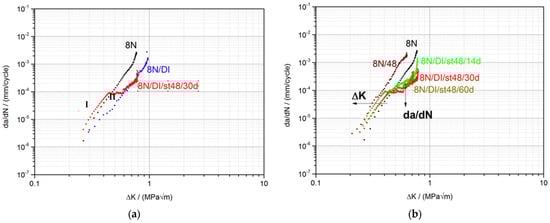 The formation of a plateau with a constant crack propagation rate that is independent of ∆K only occurs in tests with storage in DI. In this case, there is a complex interplay between the diffusion depth of the medium and the geometric formation of the plastic zone around the crack tip. The longer the immersion time in DI, the deeper the medium has already penetrated through the surface into the sample. Due to the physics of Fick’s law, it is not possible to saturate the entire sample (thickness 4 mm) with DI in a realistic experimental time. Therefore, the stored samples are still dry in the core region. The amplitude of the stress intensity factor ΔK at the crack tip creates a plastic deformation zone. With increasing stress intensity ΔK, the zone increases in volume. At a certain stress intensity ΔK, the formation of the plastic zone is strongly influenced by the medium in the surface layer of the specimen—perpendicular to the crack propagation direction (see arrow in Figure 6 sample 8N/DI/st48/60d). The medium in the surface layer has an additional plasticizing effect, so that an increase in the stress intensity is compensated for by further volume work in the form of disentanglement phenomena in the surface layer penetrated by the medium. Above a certain threshold, this causes only a very small increase in the crack propagation rate (da/dN) (plateau area). If ΔK increases further, the crack propagation is accelerated again, since micromechanically, it is no longer the disentanglement processes of the macromolecules which dominate the crack propagation, but rather chain fracture. This means that in a certain ΔK area, particularly the penetrating medium delays the crack initiation. The ΔK level that has to be reached for the penetrating medium to influence crack growth depends strongly on the storage time at 48 °C.