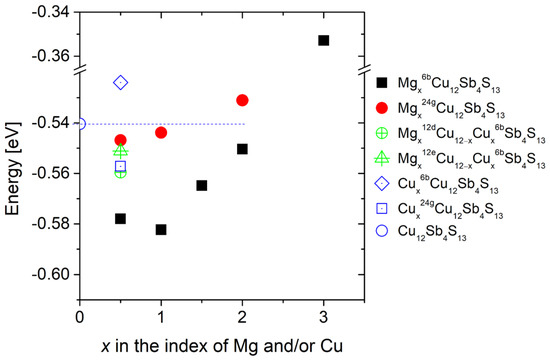 where both EForm and Etot are in eV/atom units. The results of the calculations of the energy of formation show (Figure 2) that the most energetically favorable structures are those in which magnesium is located in structural voids in Wyckoff’s position 6b in amounts of 0.5 and 1 atoms per unit cell. The introduction of larger amounts of magnesium significantly raises the formation energy. This may suggest that the solubility limit of magnesium in the tetrahedrite structure will exist for a concentration of Mg less than sufficient to fill all structural voids in the 6b position. Further, energetically favorable are structures in which magnesium replaces copper at positions 12d and 12e and, simultaneously, copper occupies position 6b. A similar energy of formation has a system in which one copper atom per unit cell occupies the □24g void. In the case of copper inserted in the 6b or 24g voids, it is clear that the latter is energetically more favorable. This result is in agreement with experimental results from the work of Vaqueiro et al. [16] and Makowitzki et al. [20], confirming the correctness of the performed calculations. On the other hand, comparing the formation energy of structures with Mg in the 6b voids with EForm of structures with Cu in the 24g voids, it can be seen that the structures with Mg are energetically more favorable.