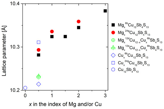 Calculated lattice parameters of MgxCu12Sb4S13 and Cu12+xSb4S13. The upper indexes indicate the position of the atom in the structure for which calculations were carried out. If not indicated, Cu, Sb and S occupy their nominal positions, i.e., 12d/12e, 8c, 24g/2a, respectively.