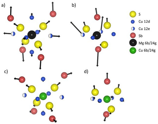 The structural void at Wyckoff position 6b is larger and more symmetrical than the one at the 24g position, which means that filling structural void □24g with Mg should yield comparably greater changes to its local environment. This is noticeable in Figure 4b for Cu12e and Sb8c atoms, where the introduction of magnesium causes a large shift in their positions. It is worth noting that most atoms do not move away from magnesium in a straight line, as their local surroundings do not always allow it. This means that the introduction of magnesium in void □24g possibly results in a higher order of bond strain and a structural “mismatch”. Inserting a copper atom into the □24g structural void has quite a different outcome (Figure 4d). From its neighboring atoms, only antimony and sulfur yield noticeable changes in their atomic position, while Cu12e and Cu12d do not shift. Copper forming directional bonds is more preferable in the smaller and asymmetrical structural void □24g, which is in agreement with the formation energy.
