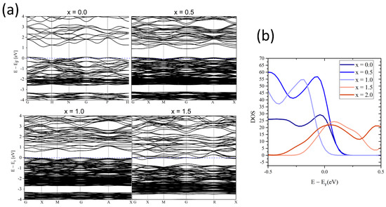 The introduction of magnesium into the voids affects the electronic structure of the resulting material, which can be observed by analyzing the evolution of the band structure of tetrahedrites during doping (Figure 5). Since Mg doping in the interstitial sites introduces an additional two electrons for each Mg atom, hole compensation and increase of Fermi level occur, which is accompanied by a decrease in electron hole concentration for x < 1, and for x > 1 the Fermi level is shifted to the conduction band and the electron concentration increases. The introduction of Mg atoms in amounts higher than 1 at./formula unit (f.u.) should allow for obtaining n-type conductivity in tetrahedrites, both in the case of the introduction of Mg atoms into 6b voids and into 24g voids. Additionally, it can be observed that under doping the value of the energy gap decreases, which in the extreme case, for x = 3, can lead to semi-metallic properties (Figure S1 in Supplementary Materials). Simultaneously, with the decrease in the energy gap, significant changes in the position of the extrema in the lowest-lying conduction bands occur, resulting from the large contribution of Mg s-type character orbitals, Sb p-type character orbitals and Cu d-type character orbitals. Modifications of the highest bands in the valence band are much smaller than in the conduction band and concern mainly the H point and its surroundings.