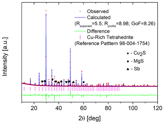 Example observed x-ray diffraction pattern with pattern calculated from Rietveld refinement for Mg0.5Cu12Sb4S13 sintered sample.