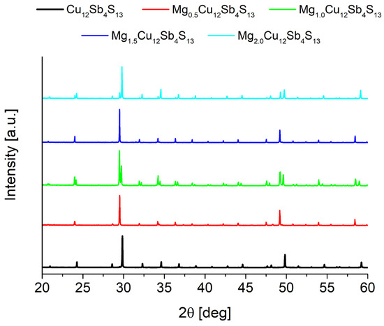 The established procedure made it possible to obtain practically pure Cu12Sb4S13 and Mg-doped MgxCu12Sb4S13 with small amounts of impurities, which was confirmed by XRD studies and SEM observation with EDS composition analysis.