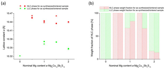 Lattice constants measured for tetrahedrite phases present in MgxCu12Sb4S13 samples after sintering (a) and weight fraction of the high lattice constant phase in these samples (b).