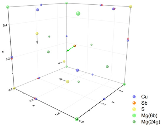 Example plot of atomic position shifts (arrows show 10× multiplied atomic position shift) for Mg0.5Cu12Sb4S13 sample (pure Cu12Sb4S13 sample is used as a reference).