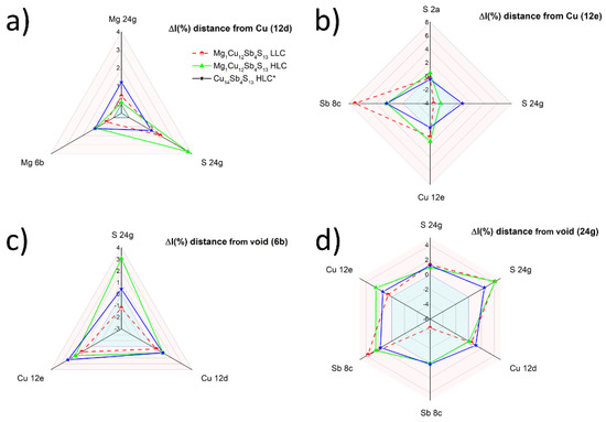 Plots of the relative change in bond length or distance Δl upon doping with Mg meas-ured at different atomic sites for Mg1Cu12Sb4S13. (a) Cu 12d site, (b) Cu 12e site, (c) void 6b site, (d) void 24g site. Results are expressed as a percentage of a given bond/distance. * Results for Cu14Sb4S13 from [16].