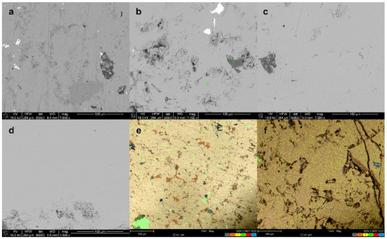 Scanning electron micrographs of MgxCu12Sb4S13 sintered samples. (a) Mg0.5Cu12Sb4S13; (b) Mg1.0Cu12Sb4S13; (c) Mg1.5Cu12Sb4S13; (d) Mg2.0Cu12Sb4S13; (e,f) Mg0.5Cu12Sb4S13, Mg1.0Cu12Sb4S13 back-scattered electrons SEM image combined with EDS analysis.