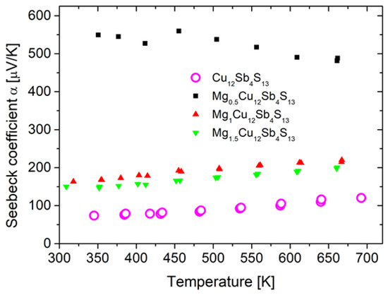 Electrical measurements were performed for a reference sample of pure tetrahedrite, and for samples with nominal magnesium contents x = 0.5, 1.0, 1.5. The sample with Mg content x = 2.0, due to its decomposition, was not subjected to electrical property measurements. The measured values of the Seebeck coefficient of Mg-doped samples and their temperature dependence are presented in Figure 12. The Seebeck coefficient for all of the measured specimens has positive values throughout the whole measurement range, which indicates the p-type nature of the materials obtained. For pure tetrahedrite, the Seebeck coefficient value at room temperature is close to 80 μV/K, which is very close to the values reported by Chetty et al. [4], Levinsky et al. [7], and Vaqueiro et al. [16], and slightly lower than in the works of Kumar et al. [3] and Barbier et al. [5]. Mg doping changes the dependence of the Seebeck coefficient for the Mg0.5Cu12Sb4S13 sample, which becomes inversely proportional to temperature and, at the same time, the values of the Seebeck coefficient increase several times compared to the pure tetrahedrite sample. For samples with higher Mg content, which show presence of phase with low lattice parameter, the Seebeck coefficient decreases with increase in the Mg content, showing temperature dependence similar to pure tetrahedrite. An increase in Seebeck coefficient during Mg doping was also observed by Levinski et al. [7]; however, the maximum values that were reported are much lower. Since most of the dopants used in optimizing the thermoelectric properties of tetrahedrites are aimed at reducing the carrier concentration, i.e., hole compensation, an increase in the Seebeck coefficient during doping is observed for most of the dopants studied. In most of the works found in the literature, the maximum Seebeck coefficient values reach around 200 μV/K. The highest values reported were observed for Co [14] and Mn [11] doping and were 300 and 400 μV/K, respectively. For most of the materials studied, the Seebeck coefficient at temperatures above room temperature increases almost linearly with temperature. Only in the work of Vaqueiro et al. [16], in which excess copper was introduced into the structural voids, a more complex dependence was observed, where up to a certain temperature (phase transition temperature), the value of the Seebeck coefficient decreases to undertake a dependence typical of tetrahedrites above this temperature.