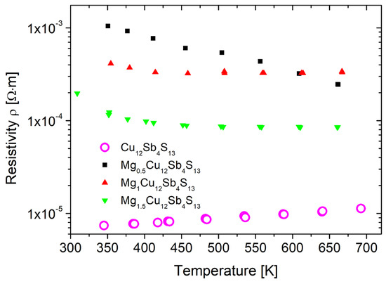 The results of electrical resistivity measurements are shown in Figure 13. The electrical resistivity of pure tetrahedrite has a metallic-like temperature dependence and decreases slightly with temperature. The resistance values are similar to those reported in the literature. The doping with Mg causes a pronounced increase in resistance, the maximum of which is observed for the Mg0.5Cu12Sb4S13 sample. At the same time, the character of the temperature dependence changes to semiconductor-like. Such dependence may result from the compensation of holes by electrons provided by Mg atoms built into the tetrahedrite structure. As can be supposed from the results presented above, the HLC tetrahedrite phase has Mg built into the voids 6b, which according to the electronic structure calculations provides two electrons per formula unit, in contrast to the phase where Mg is replacing mono- or divalent Cu, and can provide a maximum of 1 e/f.u. This hypothesis is also consistent with the results of the Seebeck coefficient where high value of the Seebeck coefficient for Mg0.5Cu12Sb13 is probably a result of the strong compensation of holes by electrons donated by Mg and consistent with the results of the DFT calculations. The addition of a larger than x = 0.5 amount of magnesium causes a decrease in resistivity, but it is still higher than for pure tetrahedrite. Such a result can be linked to a change in the ratio of the two tetrahedrite phases and increasing content of the tetrahedrite phase with the smaller lattice constant, which is likely to contain no or less Mg filling the structural voids, resulting in a higher hole concentration and lower resistivity. The nature of the observed changes in electrical properties indicates that Mg behaves as a typical donor dopant, especially in the case of a HLC phase, which is consistent with theoretical predictions for the filling of the 6b structural voids by Mg atoms.