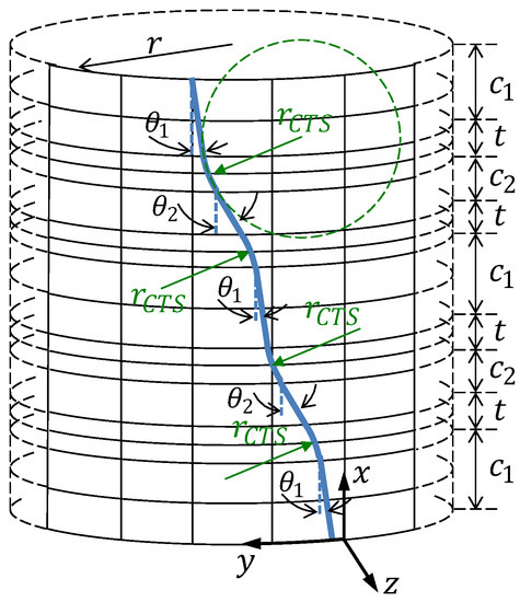 as shown in [35,36,37,38]. This is true if we assume that the shift direction of the deposition head, where it moves to start the next tow, is the circumferential direction of the cylinder. The transition regions t that are located between the two regions and are made by steering the fibers with a defined steering radius , being mm [35], as inspired by the work of Ummels and Castro [39] on overlap-stiffened structures suggesting pre-determined steering angle values. In the present study, it is assumed that the fiber angles in the transition region change linearly with x. Hence, the length t can be calculated as