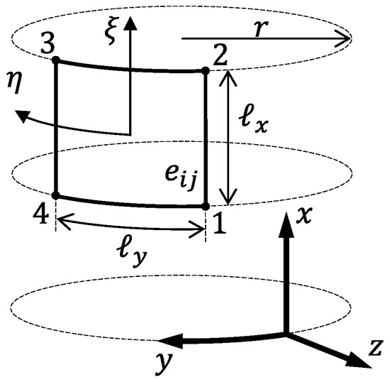 noting that the partial derivatives of are directly calculated from the shape functions of Equation (14) in terms of the natural coordinates , using the Jacobian relations and .