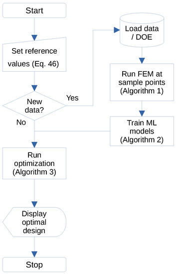 Although finding suitable reference values for the new objective function (Equation (11)) is not trivial, the current proposition consists in the usage of machine learning strategies as a heuristic to provide useful estimates. Those parameters will then be used as part of a global optimization procedure, in the domain of mixed-integer variables, which will refine the search of the global optimum.
