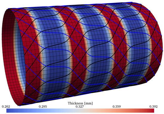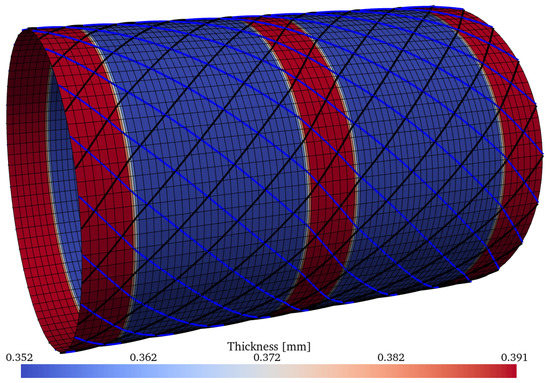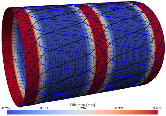 The parameterization developed herein took into account the nonlinear steering–thickness variation, which resulted in hoop-oriented regions of variable thickness for steering angles larger than zero. The maximum number of regions of larger thicknesses depends on the minimum fiber-steering radius, here assumed to be 50 mm, reportedly achievable by the CTS process.