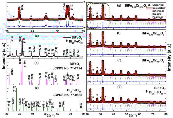 The identification of the crystalline phases present in the nanoparticles and variations in the structural parameters as a consequence of Cr doping in BFO was performed by investigating the X-ray diffraction patterns. Figure 1a demonstrates the XRD pattern of undoped BFO obtained experimentally. This pattern shows the sharp peaks indicating the polycrystalline nature of the nanoparticles. The initial identification of the peaks was performed by matching with the standard peak positions corresponding to the JCPDS card numbers: 71-2494 for pure BiFeO3 and 77-0865 for Bi25FeO39, as displayed in Figure 1b,c []. This reveals the presence of two phases in the samples: one, BiFeO3 as the primary phase, and the second, Bi25FeO39 as the secondary. BiFeO3 possesses rhombohedral symmetry with the R3c space group, whereas Bi25FeO39 possesses cubic symmetry with the I23 space group []. The absence of peaks corresponding to Cr shows that Cr ions are good substitutes for the Fe ions in the BFO lattice. Further, the Rietveld refinement was performed using the FULLPROF program [] to ascertain the existence of these phases. The refined patterns of BiFe0.90Cr0.10O3 are displayed in Figure 1d–g. Two-phase refinement was carried out using R3c and I23 space groups. The black lines represent the experimental data points, the overlapping red lines indicate the theoretically matched patterns and the blue line at the bottom indicates the difference between the two. Bragg’s positions of the reflecting places are indicated by the vertical lines below the peaks: the pink vertical lines indicate peak positions of the primary phase BiFeO3, and the green vertical lines indicate the peak positions of the secondary phase Bi25FeO39. The major peaks corresponding to the secondary phase are marked in the patterns. The theoretically obtained patterns agree well with the experimental data points, showing good-quality fitting. Further, the refinement process was assessed quantitatively by the values of the reliability factors and χ2 []. The values of the reliability factors and the phase fractions of both phases are indicated in Table 1. The effect of Cr doping can be clearly seen in the phase fractions. As the Cr concentration increases in the nanoparticles, the fraction of the primary phase increases and that of the secondary phase decreases. This points toward the fact that an increase in Cr content also increases the dilution limit of the primary phase resulting into suppression of secondary phase.