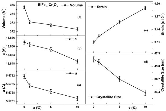 The structural parameters as functions of the Cr concentration are represented in Figure 2a–e. The value of lattice parameters (a/c) for undoped BiFeO3, obtained from Rietveld refinement, was 5.5780/13.8631 Å, corresponding to a unit cell volume of 374.8 Å3 []. These values of lattice parameters are in agreement with the literature [,]. Both the lattice parameters (“a” and “c”) were found to decrease along with the unit cell volume as Cr concentration increased, as displayed in Figure 2a–c. Likewise, the crystallite sizes calculated using Scherrer’s formula were also found to decrease with increasing Cr concentration from 45.0 nm (BiFeO3) to 34.0 nm (BiFe0.90Cr0.10O3), as can be seen in Figure 2d. Similar results have been reported by Layek et al.: they found that the minimum crystallite size was 39 nm for BiFe0.90Cr0.10O3 []. The strain calculated using Wilson’s formula [] was found to increase with increasing Cr concentration (Figure 2e). A possible reason is that the ionic radius of Cr3+ is smaller than that of Fe3+ (0.645 Å), due to which the substitution of Cr3+ (0.615 Å) in place of Fe may reduce the crystallite size and lattice parameter. Owing to this, reductions in the structural parameters have been found to increase with the increase in the Cr content in the samples. Further, these reductions in the structural parameters may be the possible cause of the strain developed in the lattice.