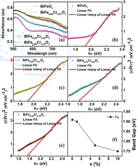Figure 4a shows the UV–Vis absorption spectra of BiFe1−xCrxO3 (0 ≤ x ≤ 10) nanoparticles in the wavelength range 500–800 nm. The maximum absorption was observed at ~510.0 nm and decreased afterward at higher wavelengths. The bands observed at maximum absorption may have arisen due to the direct charge transfer excitation involving d-d transitions between neighboring Fe3+ ions []. The values of the bandgap energies have been calculated using the Tauc’s equation, (αhν)2 = B (hν − Eg), where α: absorption coefficient, h: Planck’s constant, hν: absorbed photon energy and B: the constant. The Tauc’s plots of the samples are presented in Figure 4b–e. The linear regions of the plots at higher frequencies were linearly fitted and extrapolated, and intersected at the x-axis at zero absorption. The point of intersection gives the value of the bandgap. The bandgap energies were found to decrease with increasing Cr concentration. The value of band gaps varied from 1.91 eV for undoped BFO to 1.74 eV for BiFe0.90Cr0.10O3 nanoparticles, as represented in Figure 4f. The highest value so obtained was 1.91 eV for undoped BFO.
