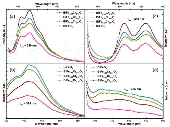 P–L spectra of BiFe1−xCrxO3 (0 ≤ x ≤ 10) nanoparticles in the ranges (a,b) 300–600 nm and (c,d) 600–900 nm with the excitation wavelengths of 350 and 325 nm.