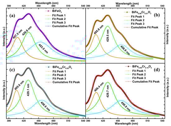 (a–d) Fitting of P–L spectra of BiFe1−xCrxO3 (0 ≤ x ≤ 10) nanoparticles in the range 300–600 nm with Lorentzian peak function.
