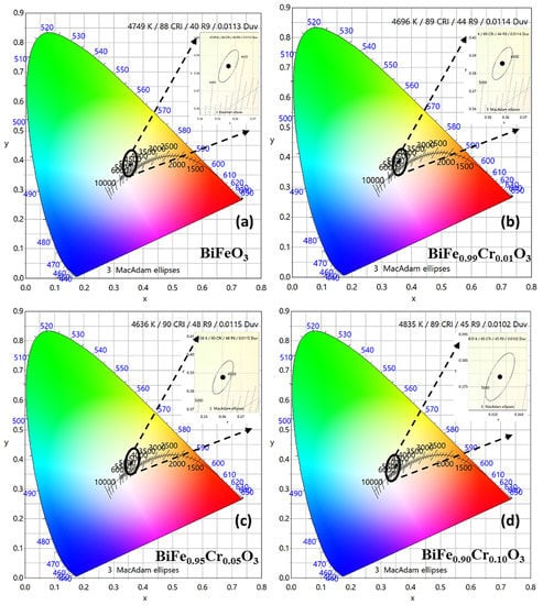 (a–d) CIE 1931 chromaticity diagram of BiFe1−xCrxO3 (0 < x < 10) nanoparticles in the range 300–700 nm; respective insets show the enlarged views of the emitted colors shown by the elliptical dots.