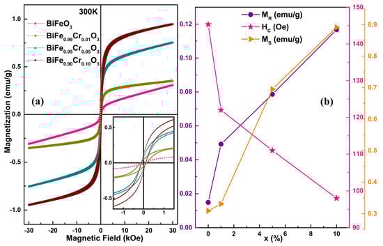 The room temperature magnetic hysteresis curves, measured at an applied magnetic field (H) of ±30 kOe, for BiFe1−xCrxO3 (0 ≤ x ≤ 10) nanoparticles, are displayed in Figure 8a. All the samples show hysteresis; however, the maximum coercivity (HC) was observed for undoped BFO only, which was reduced after doping with Cr. The coercivity was found to be 145 Oe for BiFeO3 and 98 Oe for BiFe0.90Cr0.10O3 nanoparticles, as demonstrated in Figure 8b. The decrease in coercivity may have been associated with the decreasing magnetic anisotropy in the nanoparticles []. The effect of Cr concentration on the magnetization (M) is quite evident, showing the increase in magnetization with an increase in Cr concentration. Although all the samples exhibited room-temperature ferromagnetic behavior, as displayed by the inset of Figure 8a, saturation was not attained at ±30 kOe. This may have been due to the G-Type antiferromagnetic nature originally exhibited by BFO. The ferromagnetic behavior shown by undoped BFO may have been due to its reduced crystallite dimensions resulting in the distortion of its crystalline structure. Sinha et al. have also reported that the reduction of crystalline dimensions below 62.0 nm brings ferromagnetic character in the material; otherwise, BFO is antiferromagnetic []. Therefore, to obtain saturation magnetization (MS), 1/M Vs H were plotted. The values of MS are displayed in Figure 8b. Unlike HC, MS was found to increase from 0.31 emu/g for BiFeO3 to 0.98 emu/g for BiFe0.90Cr0.10O3 with increasing Cr concentration. Similarly, remnant magnetization (MR) was also found to increase with increasing Cr concentration from 0.01 emu/g to 0.1 emu/g. These values of the magnetization parameters are comparable with other reported values []. Kharel et al. have also reported the enhancement in the magnetic properties of Cr doped BiFeO3 []. The enhancement in the magnetization of the nanoparticles as a result of increasing Cr concentration may be associated with the strong magnetic interactions caused by Fe3+–O–Cr3+ coupling. The substitution of Cr3+ ions in place of Fe3+ ions leads to strong super-exchange interactions which significantly influence the magnetic parameters by causing structural distortions [,]. Moreover, the enhancement in magnetization may also be associated with the secondary phase Bi25FeO39 []. However, this should not be the reason in present case because of the reduction of secondary phase fraction with increasing Cr concentration. Therefore, it can be concluded that increasing the doping concentration of Cr in BiFeO3 enhances the magnetic properties of the material due to the enhanced Fe3+–O–Cr3+ interactions.