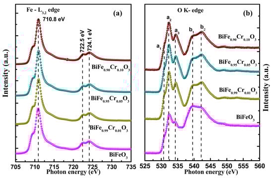 (a) Fe L3,2 edge and (b) O K edge spectra of BiFe1−xCrxO3 (0 ≤ x ≤ 10) nanoparticles.