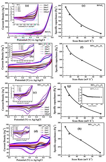 (a–d) CV plots of BiFe1−xCrxO3 (0 ≤ x ≤ 10) nanoparticles with different scan rates. (e–h) Variation in the specific capacitance of the BiFe1−xCrxO3 (0 ≤ x ≤ 10) nanoparticles electrode with different scan rates.